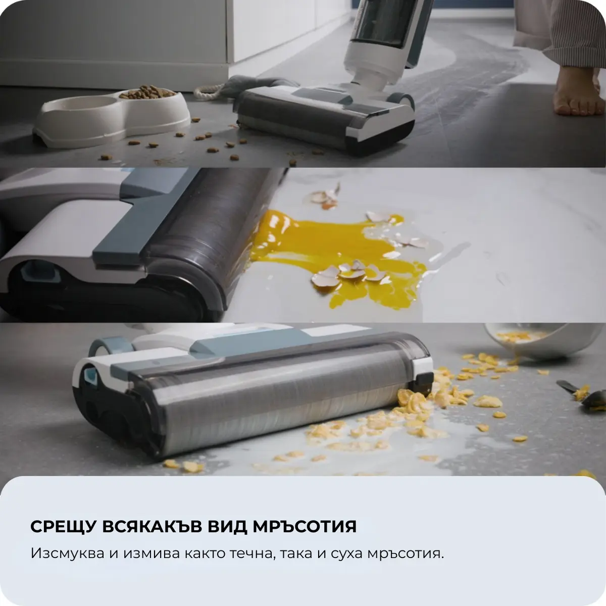 ✔ Комбинира прахосмукачка и мокро почистване — събира едновременно сухо и мокро мръсотия