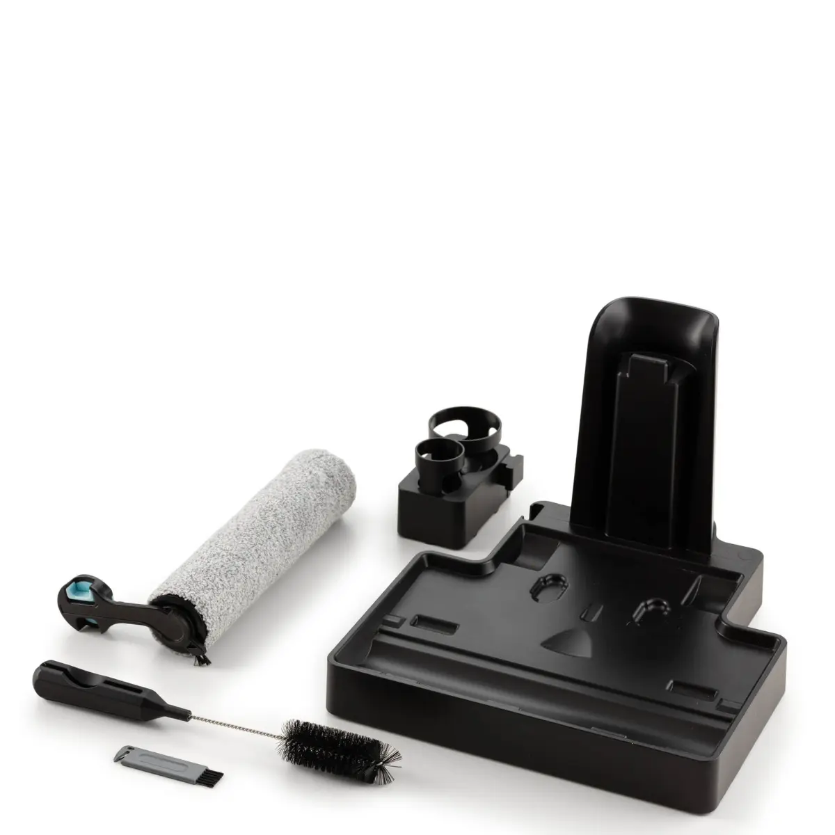 1 допълнителна кръчла четка, зарядно устройство, зарядна станция, четка за почистване, поставка за аксесоари |